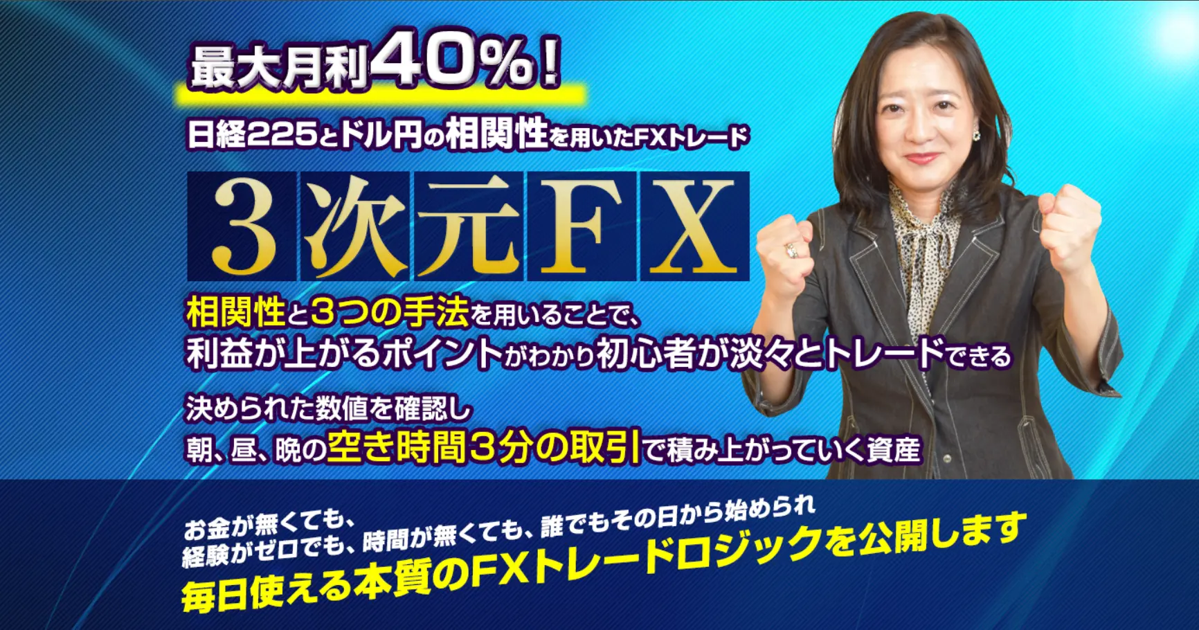 「3次元FX」は、為替(ドル円など)と日経225先物の相関性を利用したトレード手法を解説する教材です。