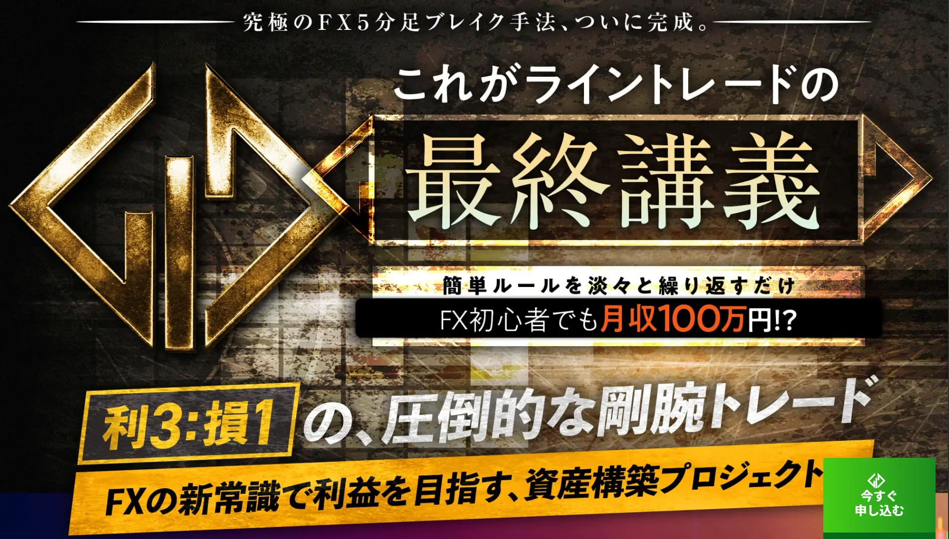 FXライントレード大全は、5分足の水平線(ライントレード)を使ったブレイクアウト手法を中心に解説した教材です。水平線の引き方やエントリータイミングをシンプルに体系化しており、短時間で完結できるトレードスタイルを強調しています。教材には動画講義やPDF教材、専用ツール、Zoomを使ったサポートセッション、リアルタイム配信などが含まれ、学習から実践までを一貫して支援する構成となっています。
