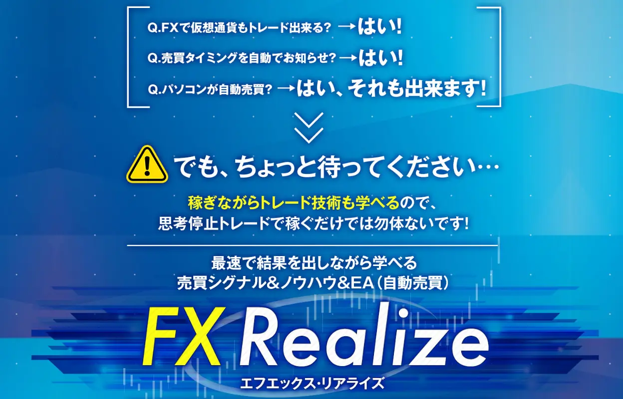 「FX Realize」は、自動売買と分析教材を組み合わせた構成で、法人運営による安心感も持たせています。