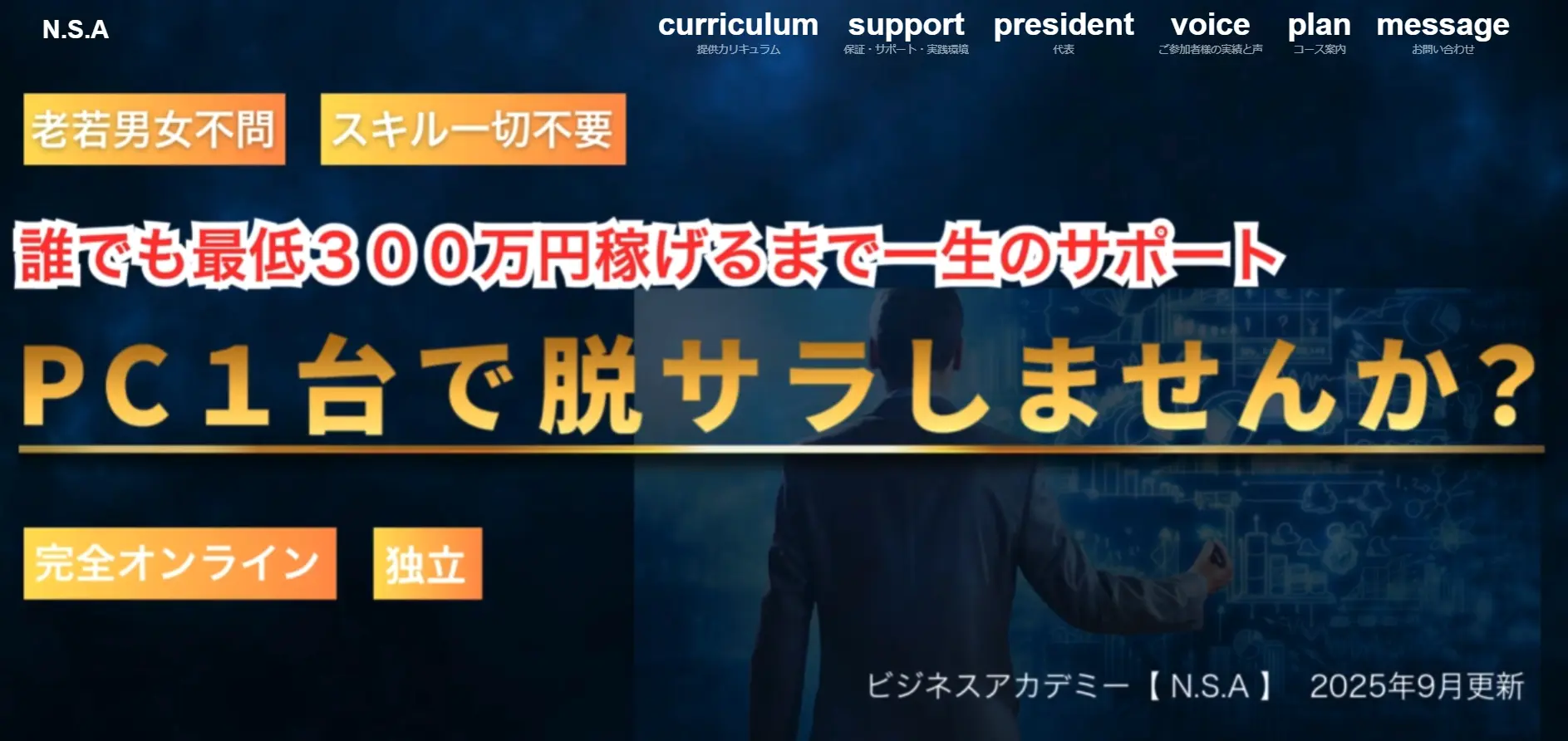 N.S.Aは、副業/商品制作/SNS活用など幅広いテーマを含む包括的な教材です。目標金額を明示した継続保証や、添削・サポート体制が充実している点は魅力的です。