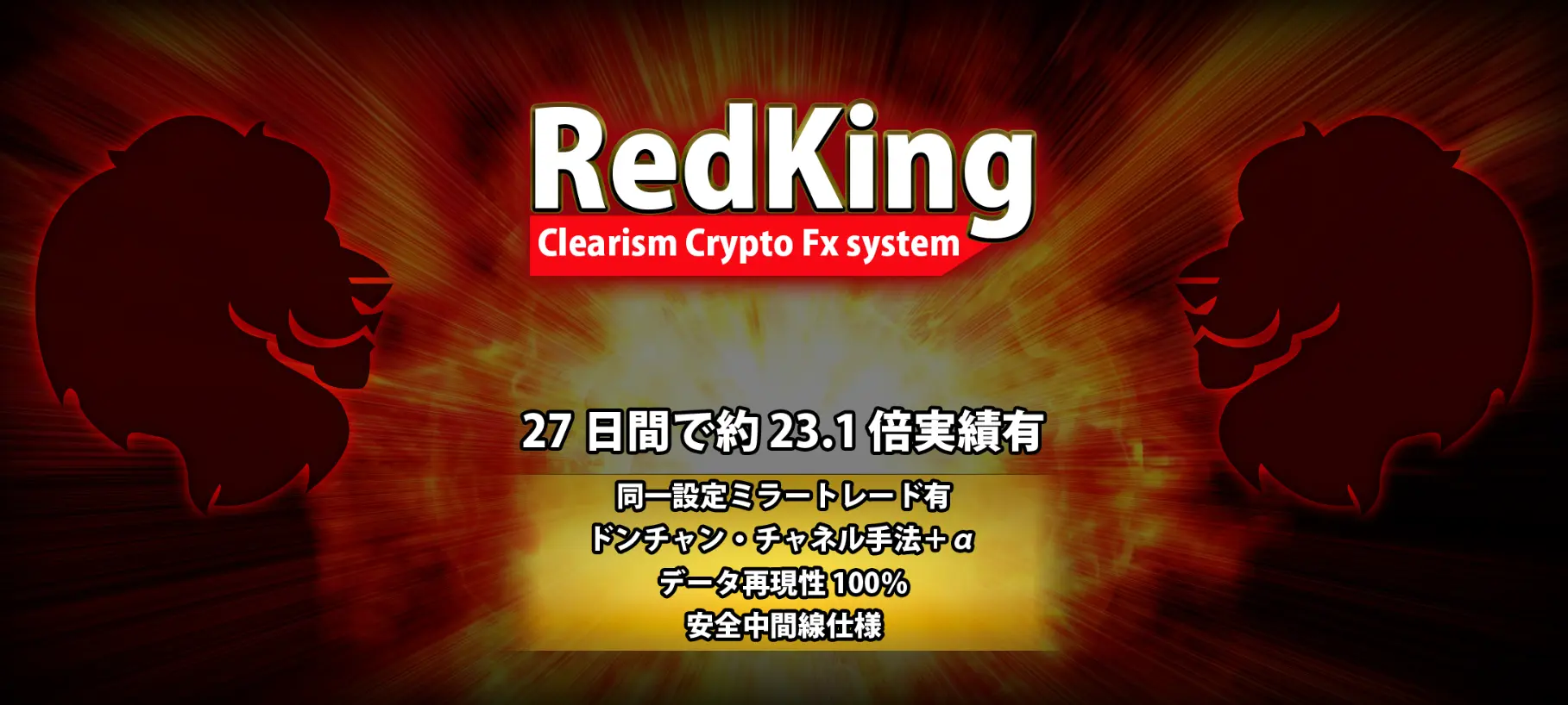 RedKingは、仮想通貨FXを対象とした自動売買ツールで、主にドンチャン・チャネルのハイバンドで売り、ロウバンドで買いを行う設計です。中間線や移動平均線、ナンピン、ゼロカット機能などを組み合わせた“プラスアルファ”システムを搭載し、幅広い通貨ペア設定に対応しています。3タイプ(SILVER、GOLD、PLATINUM)のバージョンがあり、機能や価格、VPS管理などの点で差別化されています。
